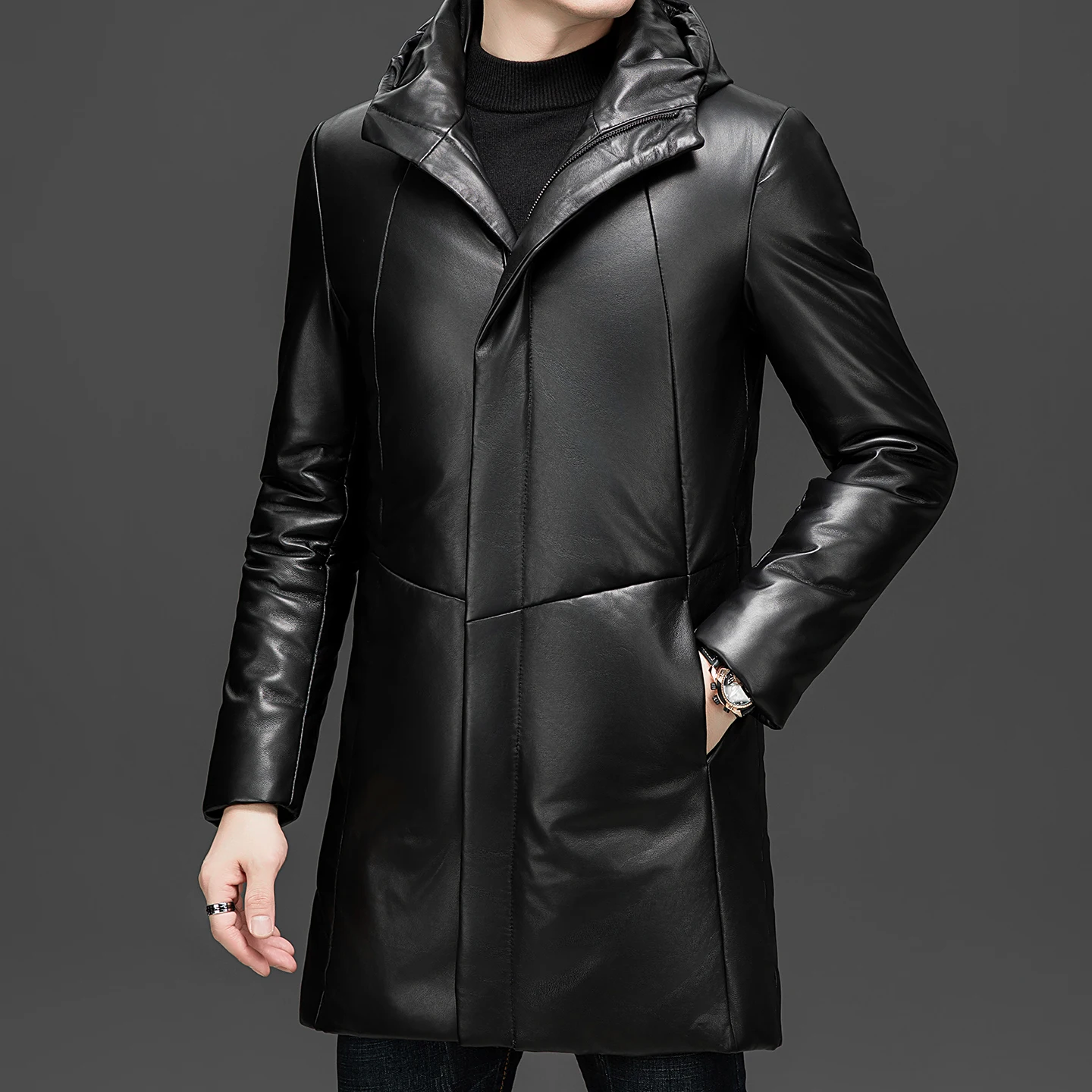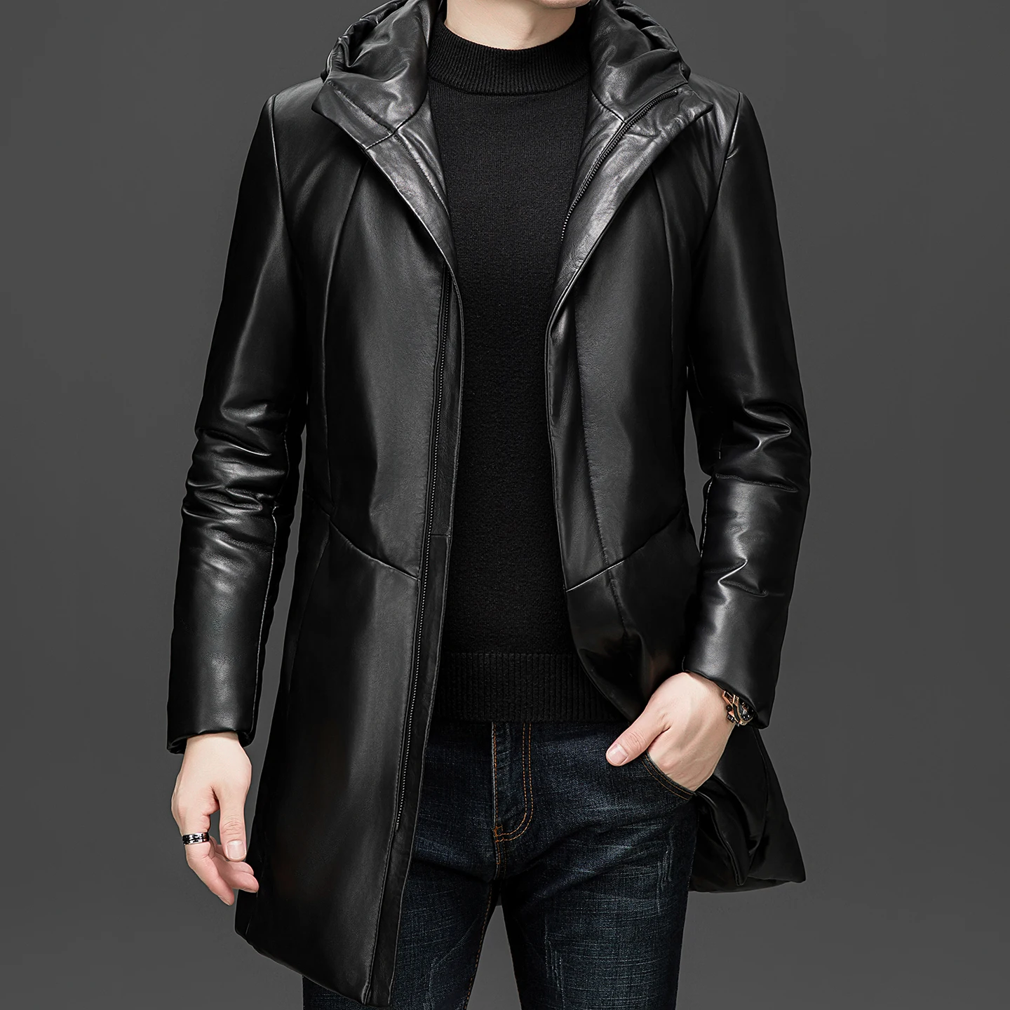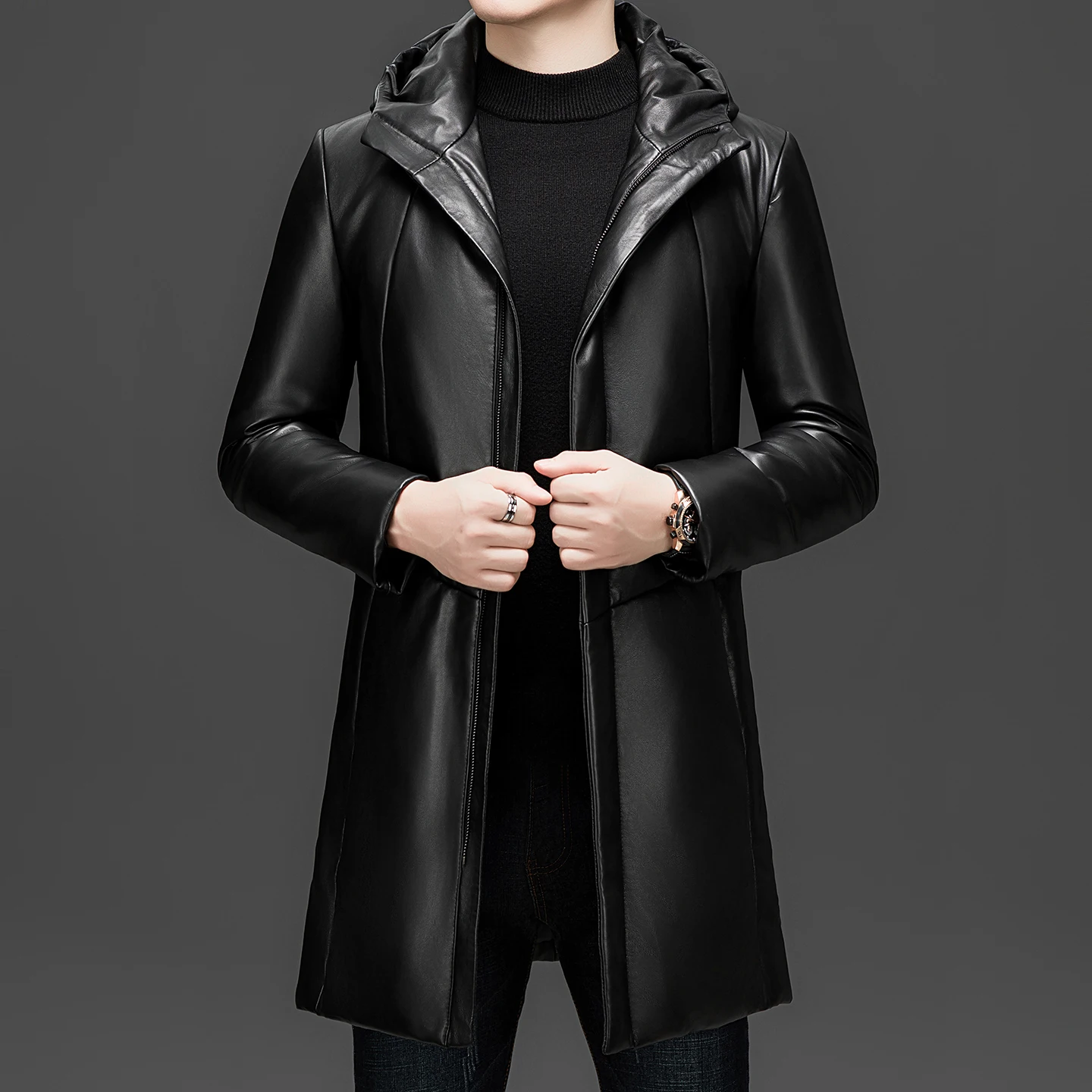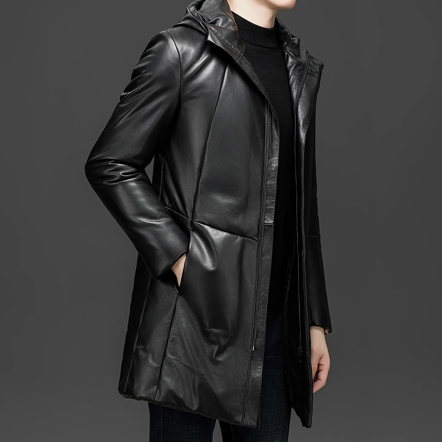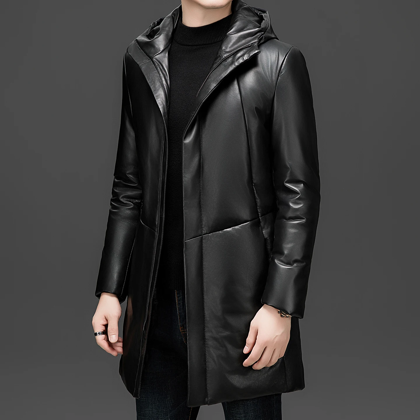 Leather Men's Down Jacket for Winter, New Style, Mid-length, Hooded, Sheepskin, White Duck Down, High-end Windbreaker Coat